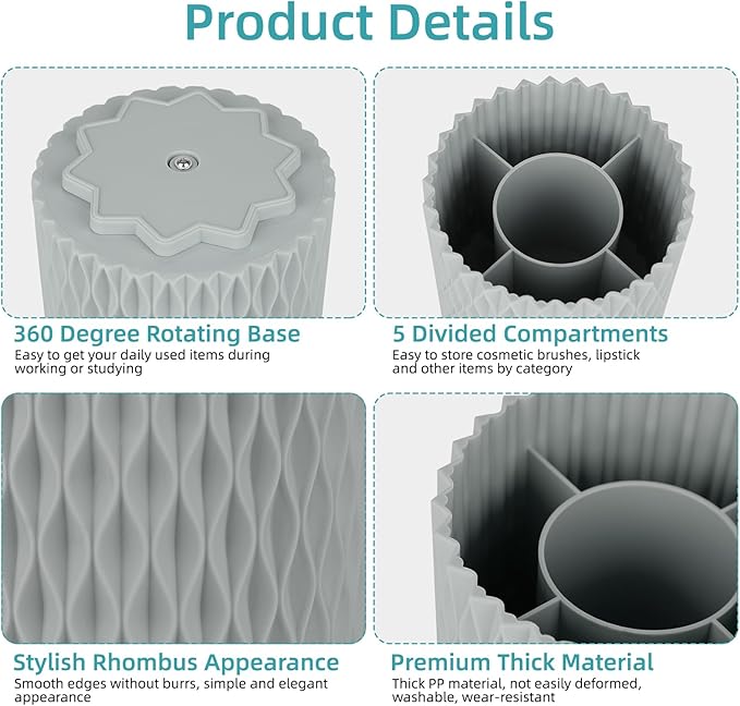 - 360 Degree Rotation Design: This desktop pen holder features a unique 360 degree rotation design, allowing you to easily rotate the pen holder and quickly find the items you need. Whether it's a pen, pencil, or cosmetics, they can be easily accessed, greatly improving work efficiency and convenience during makeup.