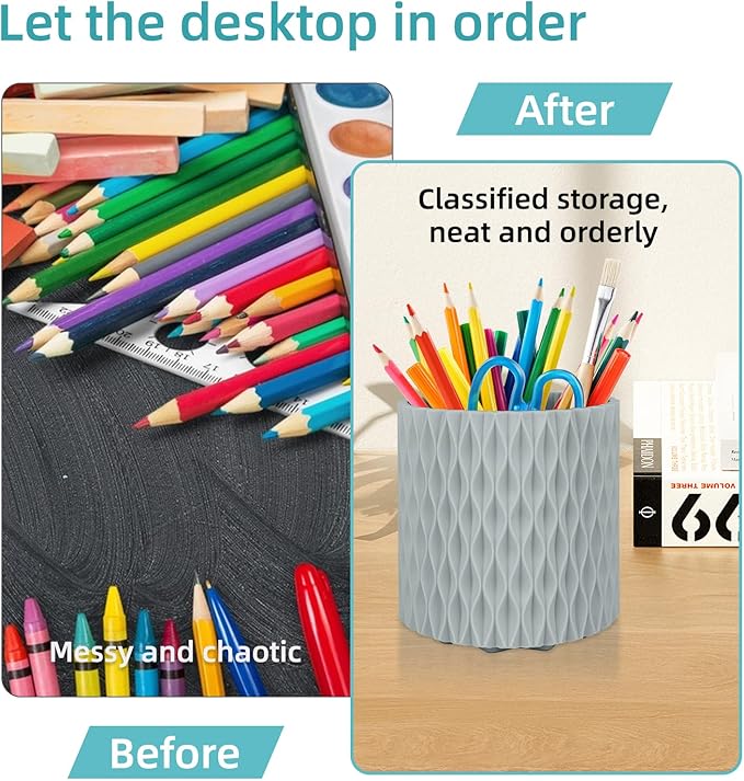 - Classic Grey Tone Design: This desktop pen holder features a classic and understated grey color, which is both simple and fashionable, suitable for various home, office, and school decoration styles. It not only adds a steady touch to your desktop, but also showcases your taste and style. Pen holder measures 4.8inร4.6inร4.6in.