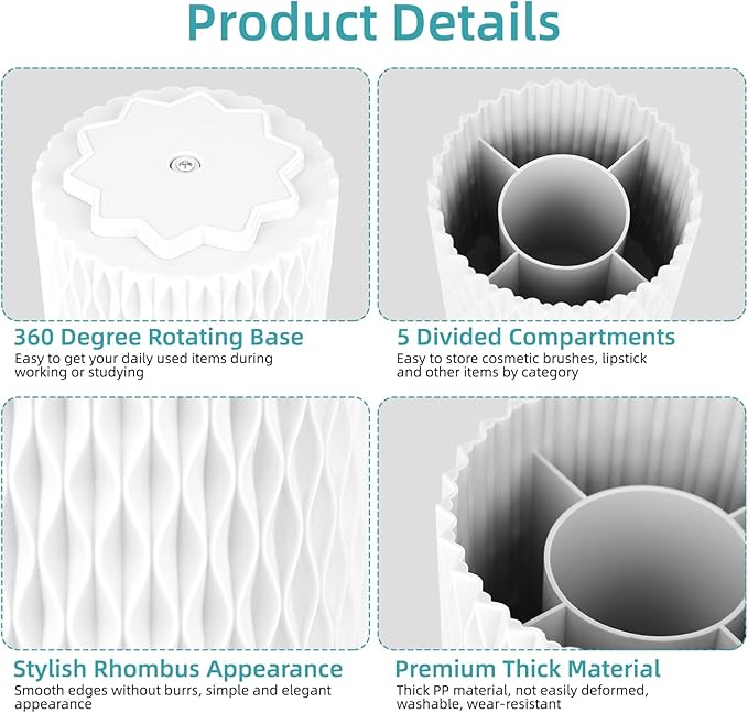 - 360 Degree Rotation Design: This desktop pen holder features a unique 360 degree rotation design, allowing you to easily rotate the pen holder and quickly find the items you need. Whether it's a pen, pencil, or cosmetics, they can be easily accessed, greatly improving work efficiency and convenience during makeup.