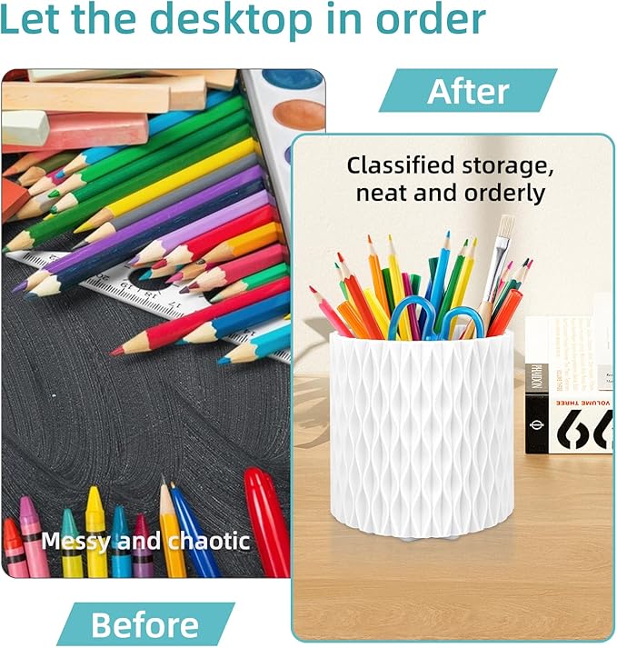 - White Pen Holder: Adopting a simple white design, the pen holder is not only aesthetically pleasing but also perfectly blends with various home, office, and school decor styles, adding a fresh and elegant touch to your desktop. Pen holder measures 4.8in×4.6in×4.6in.