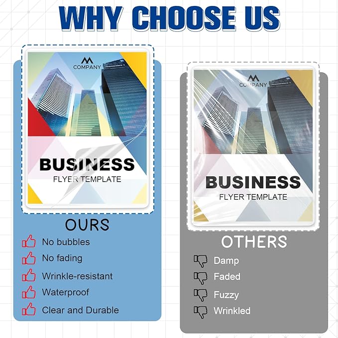 - Durable Material:These photo laminating sheets are made from premium materials,Crafted to withstand high temperatures and resist liquid penetration, stain-resistant, and water-resistant, more effectively protect your business cards.The laminating pouch with sealing temperature is recommended to be 257°F-266°F.these thermal laminate pouch guarantee that your items remain safe and intact, making them an excellent choice for both professional and personal use.