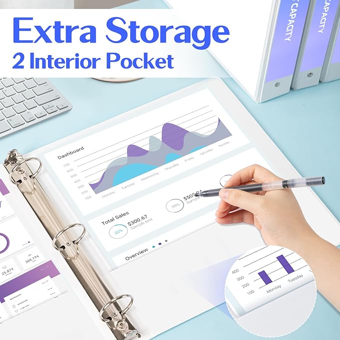 - Large Capacity: Each binder holds up to 325 sheets of 8.5x11 inch paper or 3-hole folders, with 2 interior pockets for storing unpunched or scattered papers.