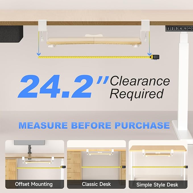 - Universal - This 20" (24.2" including clamps) x 11.8" under-desk keyboard tray holds your small keyboard, mouse, and other small accessories below the desktop to add work space. Please not it does NOT fit if your desk thickness is over 1.57β.