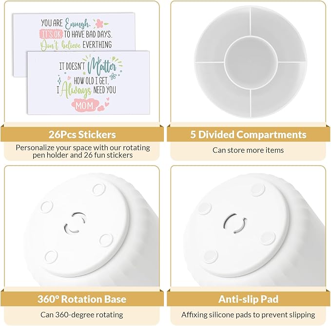 - Practical Choice: The rotating pen holder combines practicality and decoration. It keeps your workspace tidy by organizing pens, pencils, and small items, while its stylish design adds a decorative touch, making it both functional and visually appealing