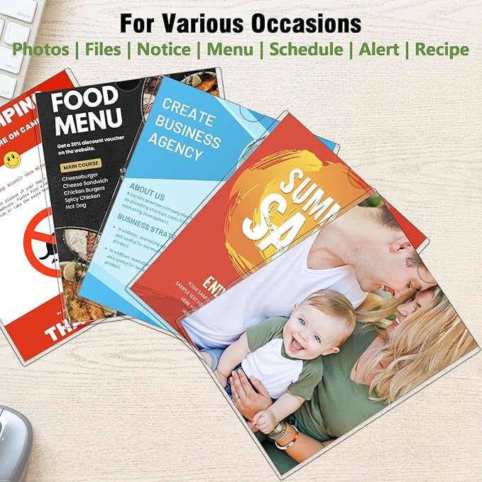- ✔ 【Easy to Assemble】 The sign holder offers multiple installation options: use the included adhesive tapes to stick it on the wall, magnetic strips to attach on a refrigerator or blackboard, or simply use it as a rigid print protector without any tapes. No drilling required, ensuring a hassle-free setup.