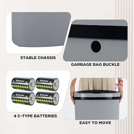 - Power Saving: Equipped with a motion sensor, the trash can operates efficiently with just 4 C-TYPE batteries, allowing for long-term usage without frequent replacements. It's designed to save energy, making it convenient for everyday use.