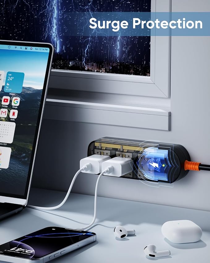 - 【Superior Protection】Our power strip features overload protection that safeguards devices by auto-tripping on overload. Operating Voltage: 100-250V,Temp: -36°F to 176°FAltitude: 2000m, the robust casing, composed of 1382°F heat-retardant ABS+PC material, and 16AWG heavy-duty extension cord makes it dependable.