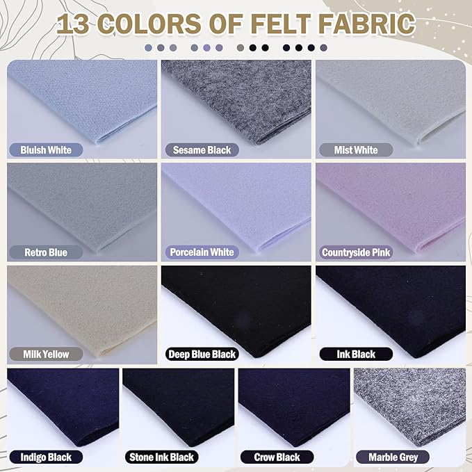 - 【BlackWhite Felt Fabric Set】:Our felt fabric portfolio contains 13 BlackWhite Series colors,the size of each roll is 8 "x35"(20.5x90cm) and the thickness of the felt is about 1.4mm. These craft felt are Thick and light tight, it can withstand prolonged use without wear or tear.