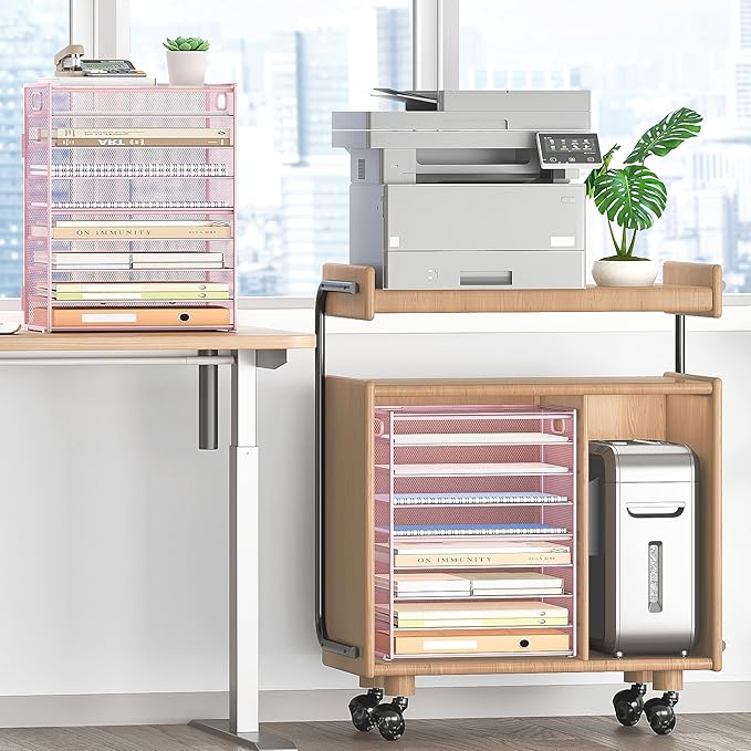 Subekyu 9 Tier Paper Letter File Tray Organizer for Desk, Pink Large Mesh Desk Folder Sorter Organizer with Handle, Include 6 Pcs Adjustable Height Slid Tray for Office Home School Supplies Storage