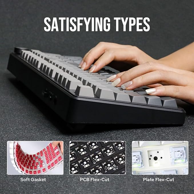 - Gasket Structure&Five Layers of Sound-Improving Materials: The F99 PRO mechanical keyboard adopts a gasket structure, extended integrated silicone pad, and PCB flex-cut to optimize elasticity and stability, providing a softer and more elastic typing experience. Equipped with 5 layers of sound-dampening materials, it enhances the acoustic effect of typing. The combination of sandwich foam, IXPE switch pad, PET sound-improving film, bottom foam, and silicone shell pad helps eliminate echo and provides stable and comfortable typing sound