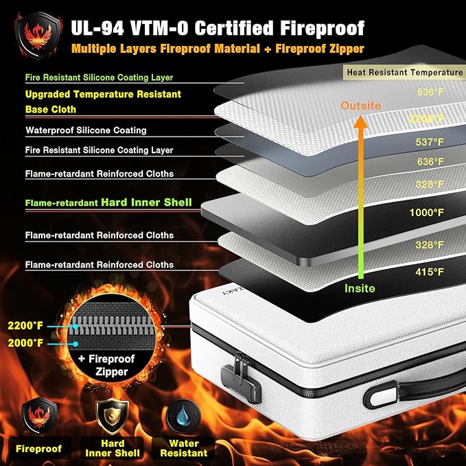 - 【Multi-Layer Fireproof & Defense】Featuring a hard inner shell and a soft exterior made of multilayer fireproof material. The introduction of a fireproof metal zipper for the first time has elevated the safety level of the fireproof box. The fireproof metal zipper is made of high-strength metal teeth and high-density fireproof base cloth, which can effectively block flames from the outside in all directions.