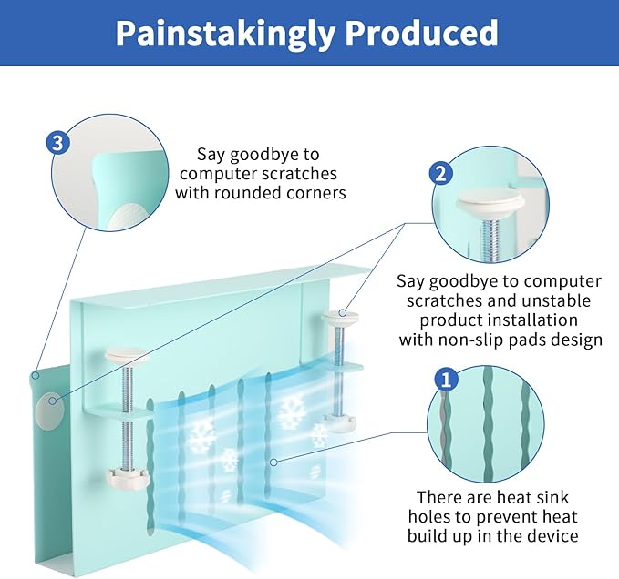 - Multifunctional Desk Side Storage & Anti -Slip And Anti -Scratch Design: This laptop holder can be retrofitted to the side of a desk to easily hold a laptop, tablet, hidden wires, interior accessories, manuals, documents, notebooks, and other items. On the inner surface of our desk side storage rack, the bottom and ends of the clamp have a non-slip sheet, which can help secure laptop in desk side hanging storage to avoid scratching desktop laptops, tablets or other devices