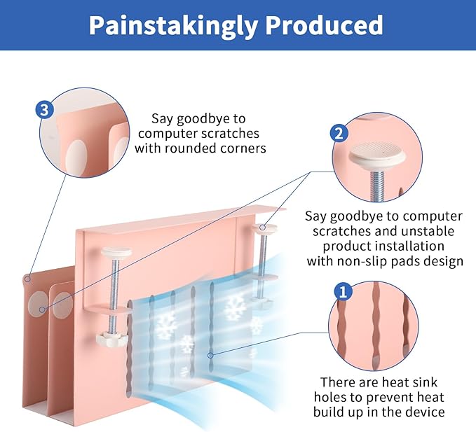 - Multifunctional Desk Side Storage & Anti -Slip And Anti -Scratch Design: This laptop holder can be retrofitted to the side of a desk to easily hold a laptop, tablet, hidden wires, interior accessories, manuals, documents, notebooks, and other items. On the inner surface of our desk side storage rack, the bottom and ends of the clamp have a non-slip sheet, which can help secure laptop in desk side hanging storage to avoid scratching desktop laptops, tablets or other devices
