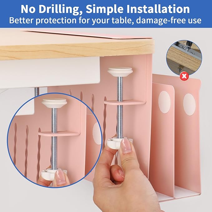 - No Drilling & Easy To Install: Our no drill desk side storage, laptop holder under desk is easy to install. And the silicone cushion can prevents scratches on desks and other objects, the rounded corners design can also avoid scratches. No extra tools are needed and importantly it won't damage your desk. (Note: Before purchasing, please confirm whether the upper and lower edges of the sides of your desk are flat and whether the size is suitable for your desk. You can refer to our pictures to confirm whether our side of desk storage is suitable for your desk.)