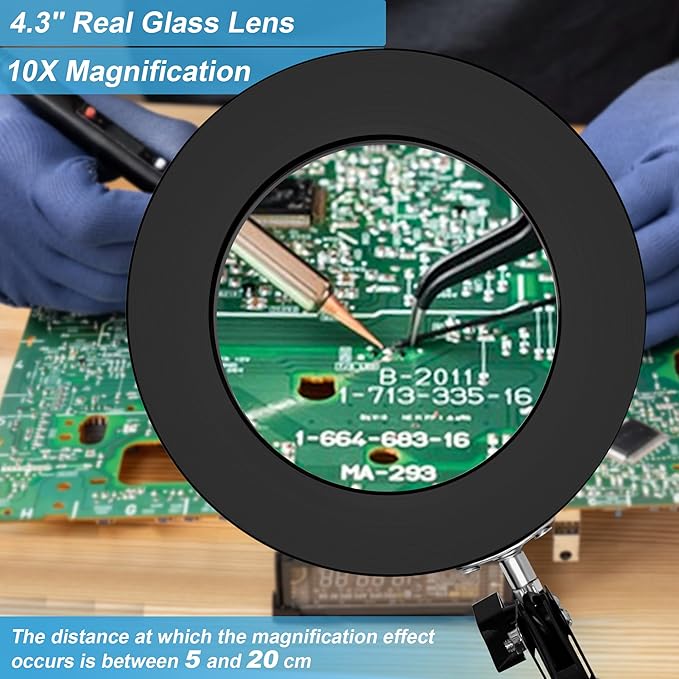 - 10X OPTICAL MAGNIFIER:10X high pure transparent magnifying glass is designed for anyone who needs to continuous close focus work or any vision problems. It is very suitable for sewing, embroidery, jewelry making, soldering, repairing electronics, etc