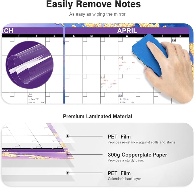 - ✨ Dry Erase Wall Calendar : is made of PET Film and 300 grams Copperplate Paper, providing a durable surface that resists scratches and smudges, while the sturdy Copperplate Paper backing keeps it in place without curling.