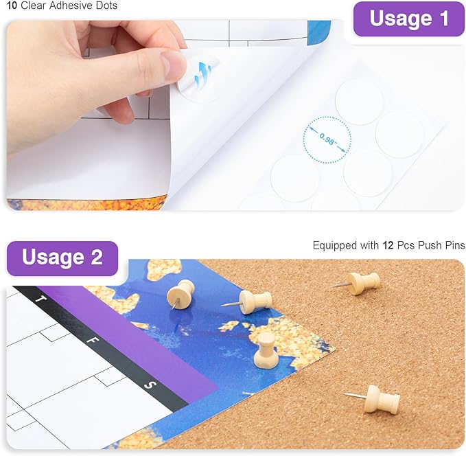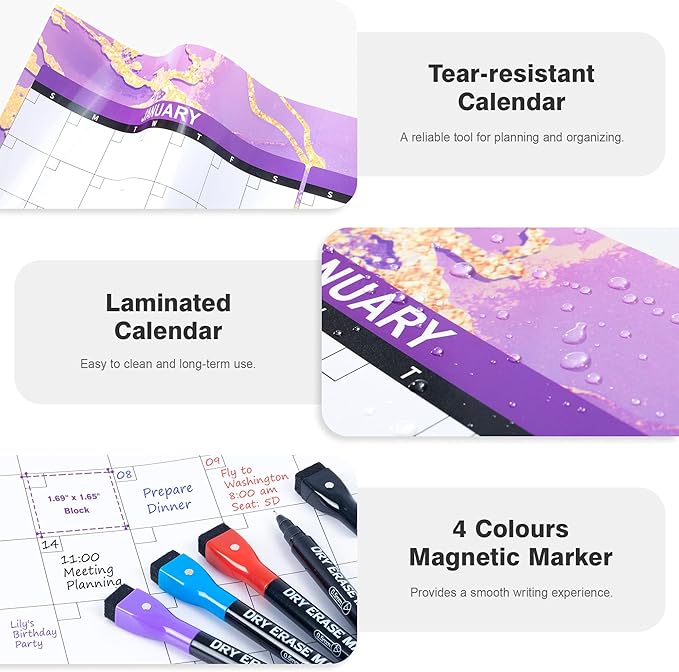 - ✨ Undated Laminated Calendar: This waterproof wall calendar comes with a mini eraser, four dry-erase markers, 10 push pins, and 10 transparent round stickers. The undated monthly calendar can be started at any time, making it perfect for long-term use.