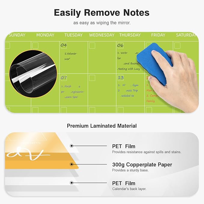 - ✨ Dry Erase Wall Calendar : is made of PET Film and 300 grams Copperplate Paper, providing a durable surface that resists scratches and smudges, while the sturdy Copperplate Paper backing keeps it in place without curling.