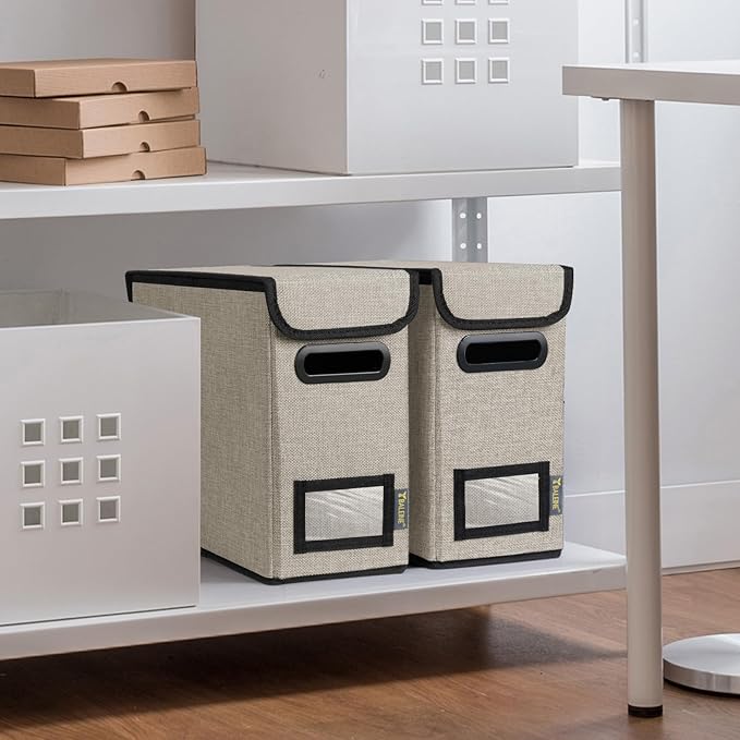 - [DURABLE MATERIAL] The outer layer of our filing box is crafted from high-quality polyester fabric and reinforced with thick cardboard in the middle. This construction ensures that the box maintains its shape and provides better bearing capacity for important documents and files. Its textured appearance can also serve as a stylish decorative element in any office or home