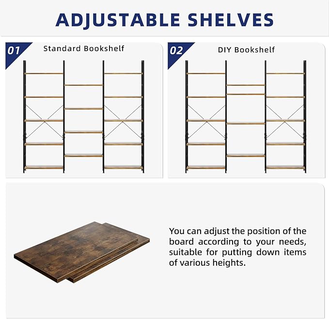 NUMENN Triple 5 Tier Bookshelf, Wide Book Shelf with 14 Open Display Shelves, Modern Tall Bookcase Furniture for Living Room Home Office, Vintage