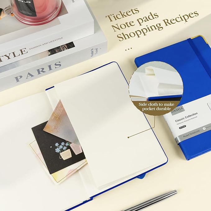 - Humanity Detail Design: A5 Hardcover Journal Note Book features an elastic pen loop, making it more convenient to carry pens of various sizes. The elastic closure band let the hardcover notebook open and close freely. 1 Expandable inner pocket can easily store notes, bills, receipts, appointment cards, and more. And 1 ribbon bookmark helps quickly find the correct page