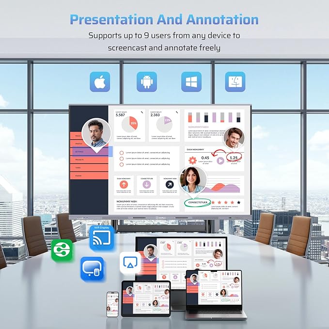 - Next-Gen Interactive Display: This smart board goes beyond traditional functions. Powerful Android 13 OS with flexible dual-system support, making the smartboard adaptable to diverse environments. Equipped with 8-core CPU, 8GB of RAM and 128GB SSD for fast performance. Streamline your workflow with one device that handles everything—from presentations to notes to file storage, making it perfect for meetings, classrooms, and collaborative spaces.