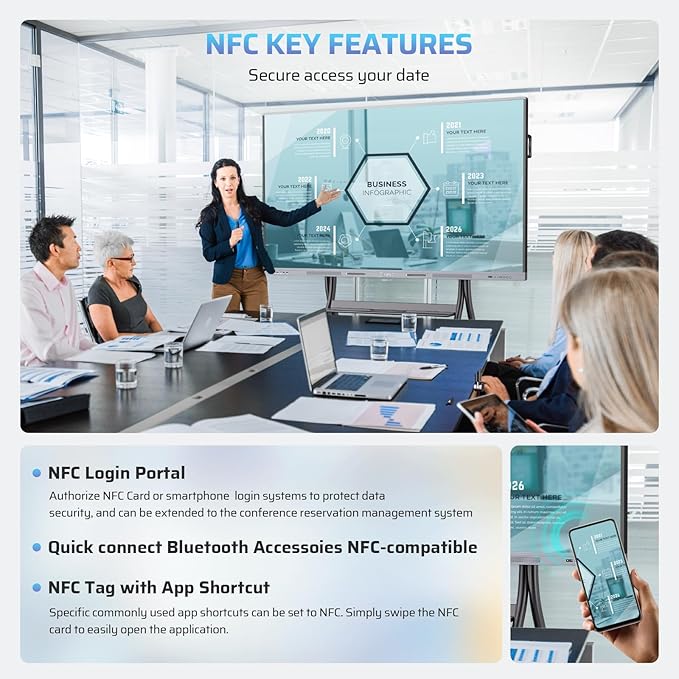 - NFC Founction: The NFC-enabled system provides secure, convenient access and seamless device pairing for conference systems. Users can quickly log in, pair devices, and share content by tapping their NFC-enabled smartphone or card. It enhances security with access control and one-touch login, ideal for corporate or educational settings, offering a streamlined, wireless experience.