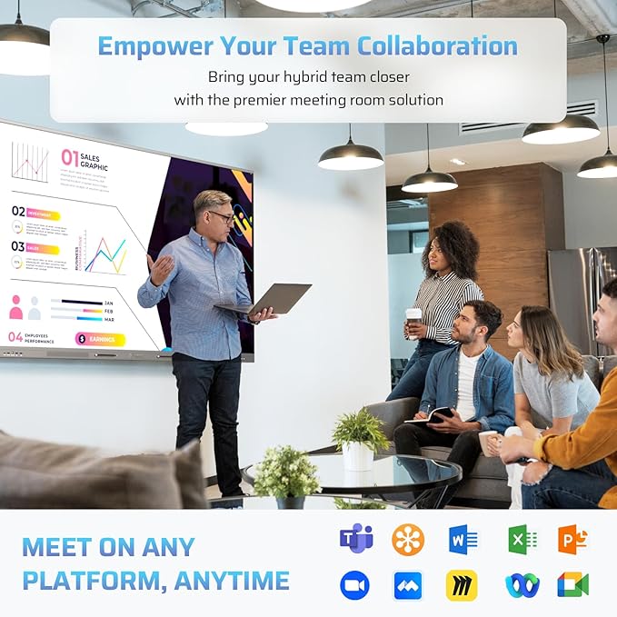 - Next-Gen Interactive Display: This smart board goes beyond traditional functions. Powerful Android 13 OS with flexible dual-system support, making the smartboard adaptable to diverse environments. Equipped with 8-core CPU, 8GB of RAM and 128GB SSD for fast performance. Streamline your workflow with one device that handles everything—from presentations to notes to file storage, making it perfect for meetings, classrooms, and collaborative spaces.
