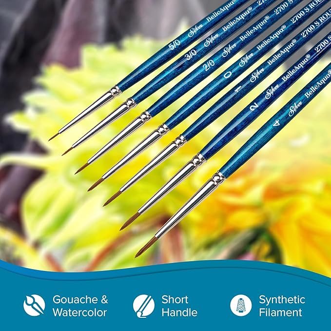 Silver Brush Limited BA-2758S BelleAqua Smaller Size Round Brushes, 3pc Round Watercolor Brush Set, Professional Soft Synthetic Red Sable Paint Brush Set Also for Gouache, Sizes 1, 2, & 4