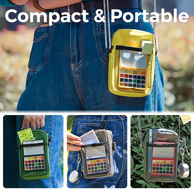- ALL IN ONE KIT - Funto Mini Semi-Moist Watercolor Paint Set meets all you need with 24-color paint, crossbody bag, travel watercolor journal, water brush, collapsible paint water cup, spray bottle, magnetic grip and clip, an all-inclusive set.