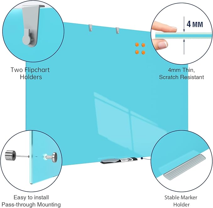 TSJ OFFICE Glass Dry-Erase Board - 48 x 36 Inches Wall Mounted Magnetic Whiteboard, Large Frameless Glass White Board for Office, Home & School, Blue