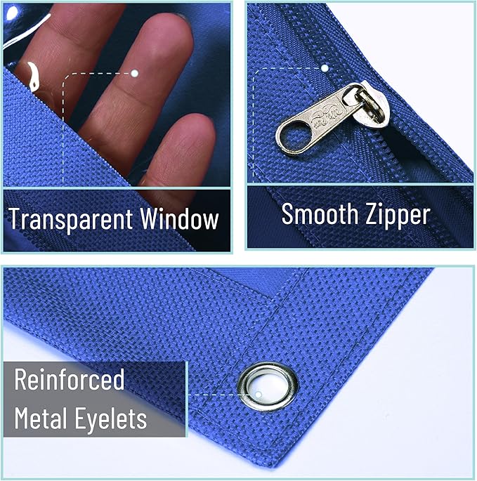 - Each pouch is crafted from durable canvas material and includes a clear plastic window, allowing for quick visibility of contents.