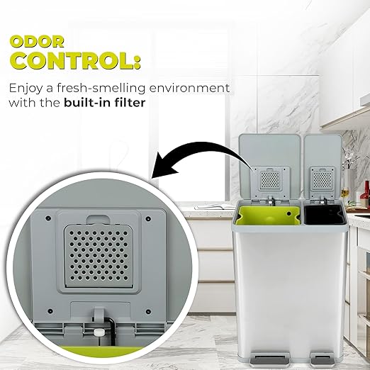 - HIGH CAPACITY WASTE AND RECYCLING SOLUTION: Color coded liners in Green (38L) and Black (22L) allow for easy sortation of waste and recycling, without sacrificing waste capacity, and fit standard liners using bag cinch.