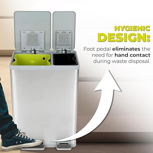 - HANDS-FREE USE: The stainless-steel foot pedal stands up to daily use and removes the need to touch the lid during waste or recycling disposal to keep hands clean.