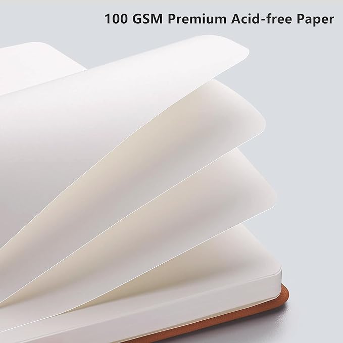 - PREMIUM PAPER: Crafted with time-resistant 100 GSM paper, our blank journal notebook preserves thoughts flawlessly while resisting ghosting/bleed-through with most pens. Acid-free material ensures long-term preservation, and its smooth surface enhances writing clarity - blending durability and premium performance