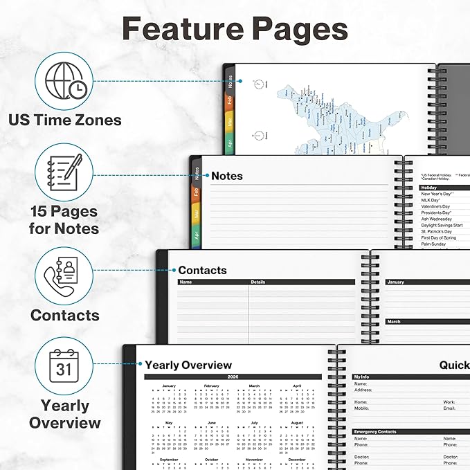 - COMPREHENSIVE ORGANIZATION: 15 note pages, contacts section, storage pockets for loose paper, holiday reference & USA time zones map. Everything needed for work, office and personal life.