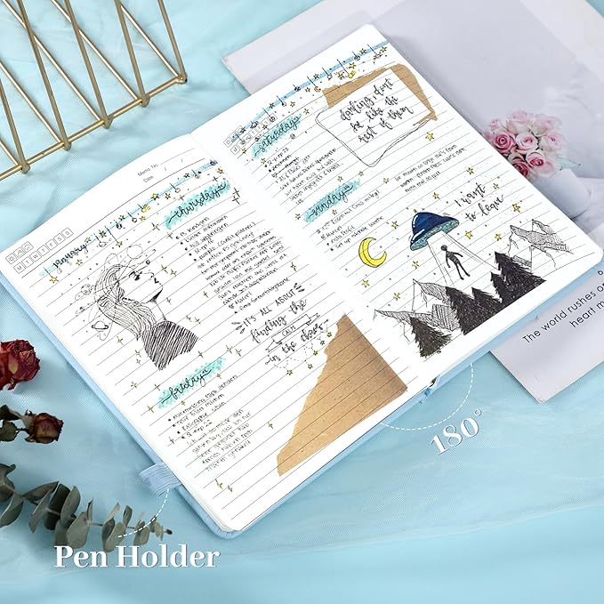 - 【Hardcover Journal Notebook】A5 notebook is made of durable and waterproof hard cover can better protect the inner pages.Side strap design and pen holder can make you more convenient to use cute notebook.