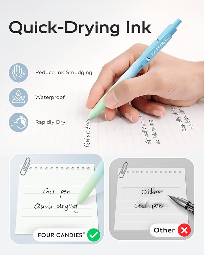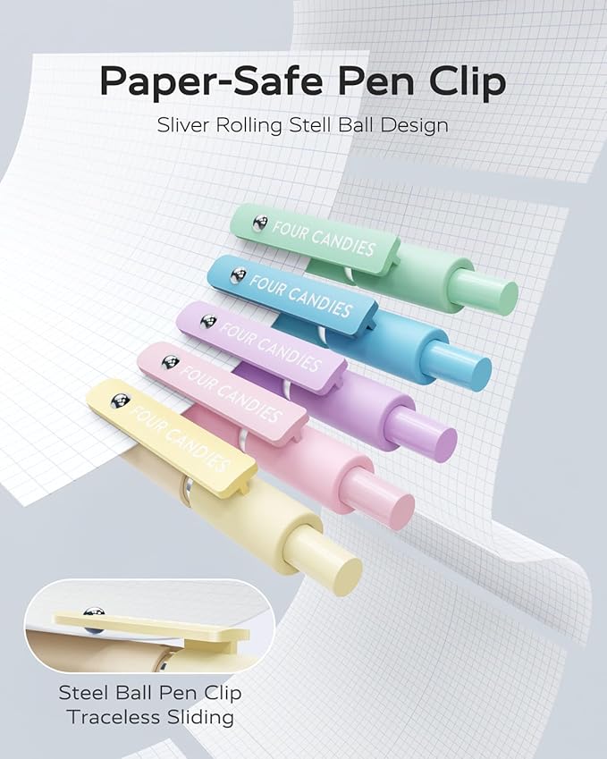 - [ Soft Grip & Multi-function Clip ]: You will receive 5pcs quick-drying ink pens with a modern minimalist design to suit your needs Daily use and replacement needs. You can clip the ballpoint pens to the book,bag,binder,or pocket easily, which is convenient to carry and prevents loss.Super soft silicone features grip bring a super soft touch feeling which makes each Four Candies gel pen easy and comfortable to hold.