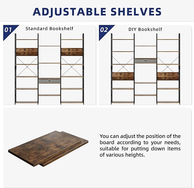 - 【Adjustable Shelves & Storage Drawer】Unlike fixed shelves that limit the height of display items, our bookshelf features an adjustable design; You can easily modify the position of each shelf to accommodate items of various sizes, storage drawer location are adjustable to create your own storage and display spaces for different need