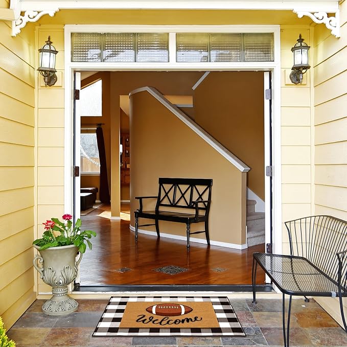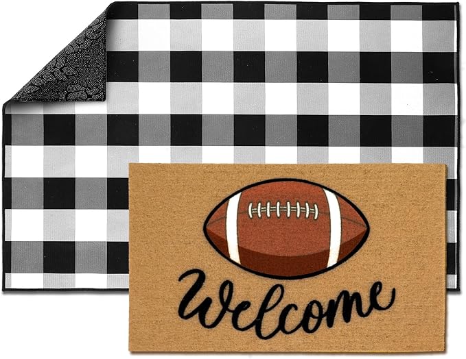 - Built to Endure: our mats withstand rain, snow, hail, sand, mud, dust; The mat's thickness is 0.4 inches, black and white plaid rug is 28 x 43 inches and football coir mat is 18 x 30 inches, ensuring your feet a worthwhile scrape before entering the house