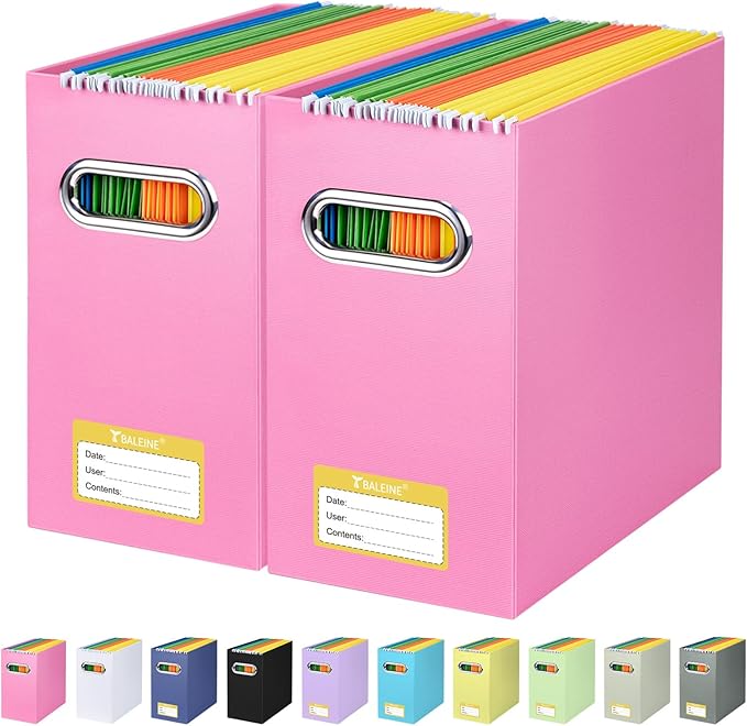 BALEINE File Organizer Box, Cardboard File Folder Organizer with Handle for Letter Size, Portable Collapsible Hanging Filing Box for Home Office Document Storage (2 Pack, Pink)