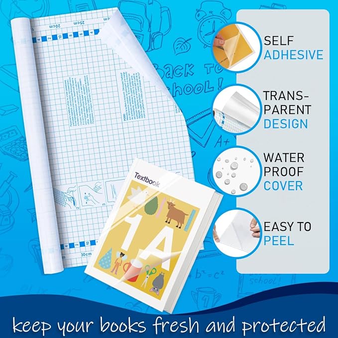 - Clear contact paper roll measures 17.5-inches wide by 5-feet long, eight rolls for around forty text-books cover DIY craft without book size fitting worries