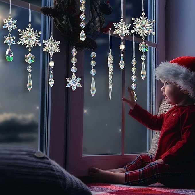 - EASY TO USE: Each crystal snowflake and icicle pendant ornament comes with a built-in rope for effortless hanging. Simply thread the rope through the included hooks or hang them directly from tree branches, door frames, or ceiling hooks. The convenient hanging design makes decorating a breeze and ensures your ornaments stay securely in place, whether on Christmas tree, doors, walls, or windows