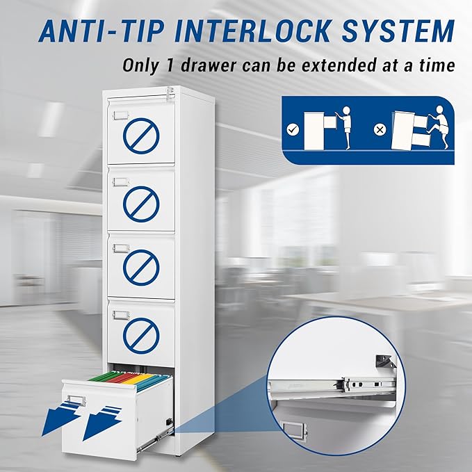 - LOCKABLE 5 DRAWERS FILE CABINET - All the file drawers can be locked by one lock, It is very convenient to control the whole filing cabinet with one key.