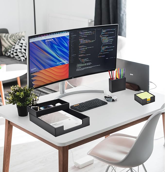 - 4-Piece Office Supplies Desk Accessories Set: 1x Resume file Paper Tray, 1x Stackable Small Letter Mail Sorter Tray,1x pencil cup holder, 1x sticky note holder. Whether you seek desk accessories for men office or desk decorations for women office, This 4 piece set of desk accessories & workspace organizers fits your office theme perfectly.