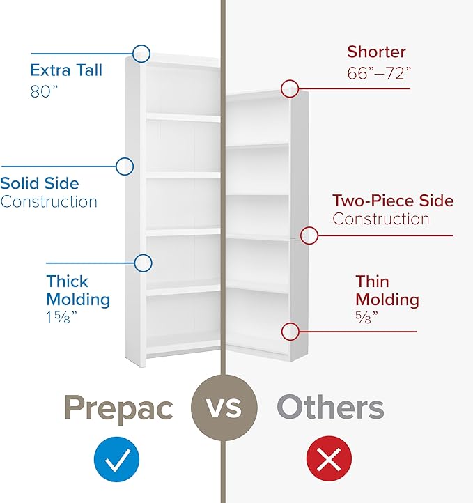 Prepac Moda 5-Tier Tall Wooden Bookcase, White Storage Cabinet, Display Cabinet, Bookshelf with Storage Shelves 31.75" W x 80" H x 12" D for Home Office, Living Room, Bedroom Organizer