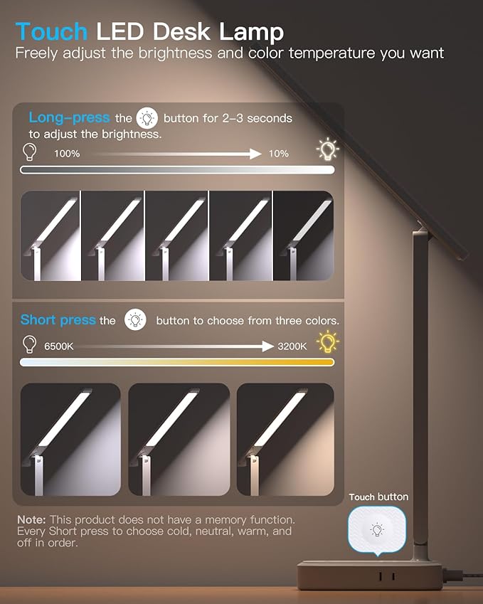 - 【Touch LED Desk Lamp 】Press the “Light" button to choose the light color. There are 3 colors to choose enabling you to customize the light you want. Long-press the "Light" button for two to three seconds to adjust the brightness of any color mode. (Please note: Extended use of the brightest light setting may cause the lamp to overheat.) In a certain light color, such as a cold color, long-press and hold the "light" button for 2-3 seconds to adjust the brightness of the light. If you want to lower the brightness, press and hold the button for 2-3 seconds again. Note: This product does not have a memory function. Every Short press to choose cold, neutral, warm, and off in order.
