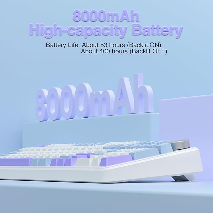 - PBT Keycaps and 8000mAh Battery: 99 keys 96% layout compact keyboard can save more desktop space while keep necessary arrow keys and number area for games and work. The rechargeable keyboard built-in 8000mAh large capcacity battery to provide more power and longer battery life. Double shot PBT keycaps, made from two colors material molded into each others, make the keycaps characters maintain the vibrance and saturation, clear and not fade