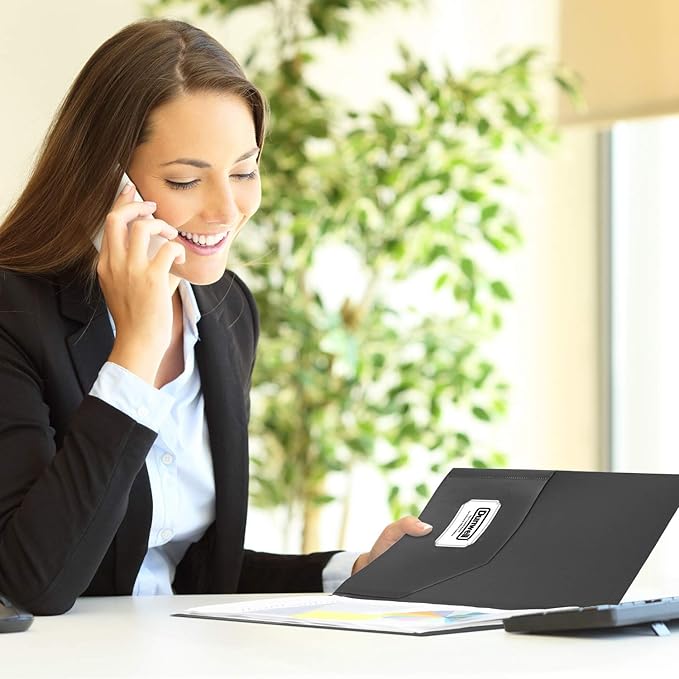 - Set of 12 Two pocket plastic folders: Twelve Plastic black folders, include adhesive labels that peel off cleanly. Use folders with side pockets as office folder, Black plastic folder