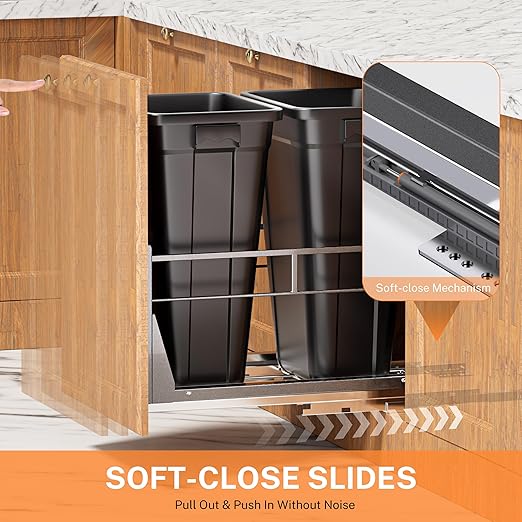 - Smooth Sliding Trash Can: Under cabinet trash can pull out with a soft-close mechanism, allowing the waste container to fully extend outside the cabinet for easy access. Continuous bearings ensure smooth and quiet operation, reducing noise during opening and closing for a more peaceful home environment.